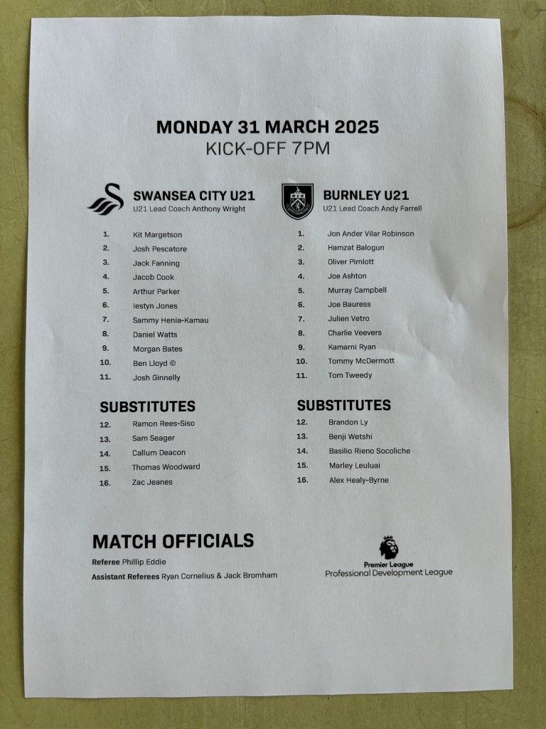 On Monday, March 31st, I had the opportunity to attend the Swansea City U21 fixture against Burnley U21 at Swansea.com Stadium. It was a thrilling match, with a solid 2-0 win for the home team, Swansea City U21.